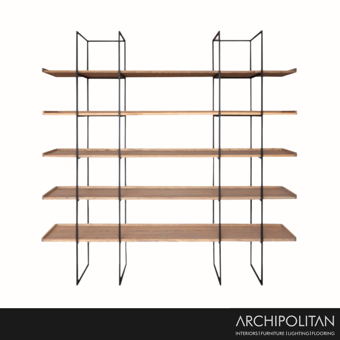 Modern loose standing shelf with wooden tops and two seperate steel frames.